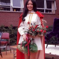 Pacific University student Jill Matsui (Class of 1972) just after her crowning as Homecoming Queen in late October, 1970. She is wearing a tiara, a red cape and a white dress, and is holding a large bouquet of flowers. According to the Pacific University student newspaper, the crowning ceremony took place between McCormick and Walter Halls. (The Index, Nov. 2, 1970, p. 1)