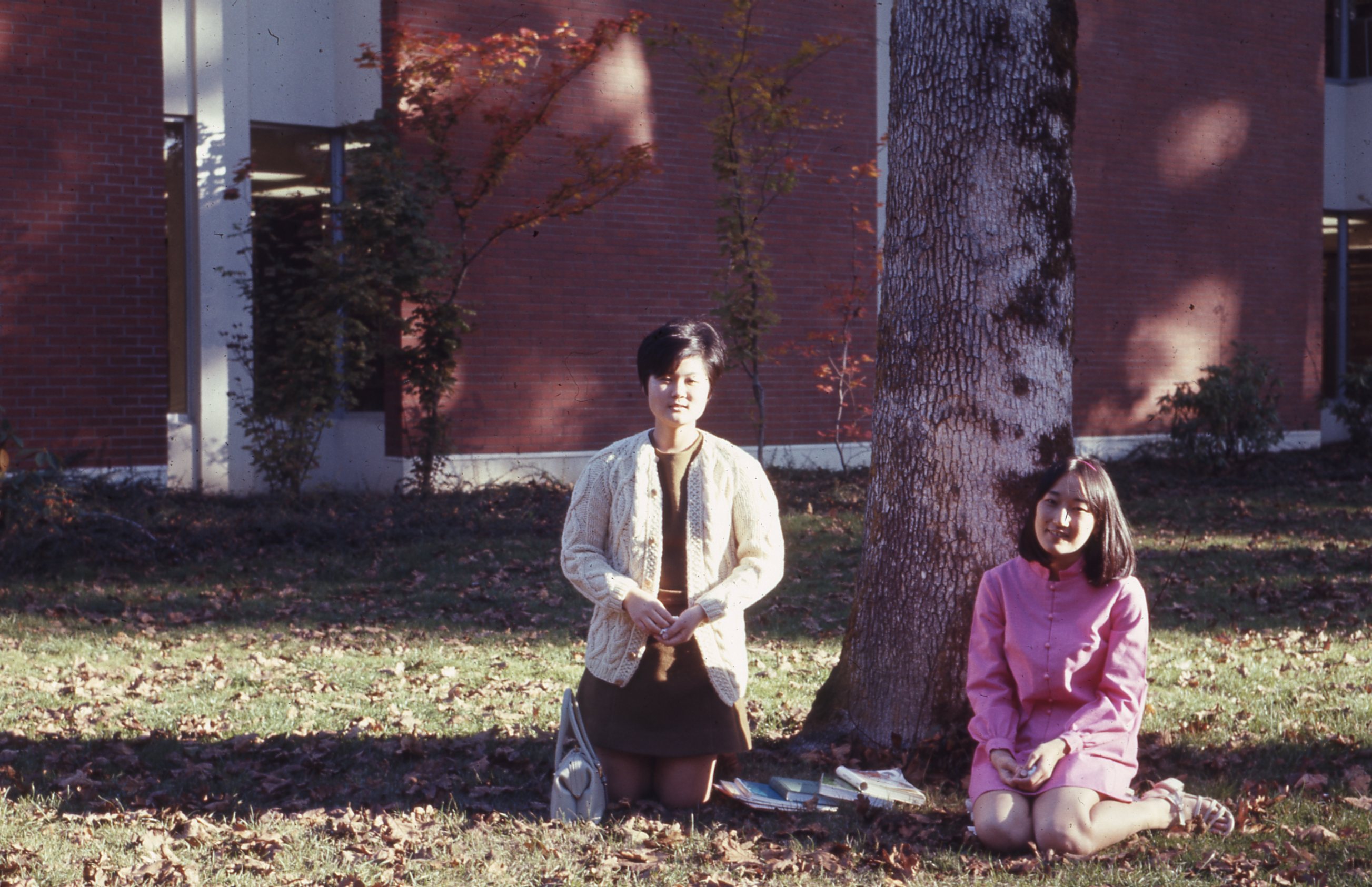 Students Anna Hisanaga (Class of 1972, wearing white) and Susan Kuioka (Class of 1972, wearing pink) sitting outdoors by Pacific University's Scott Library in the fall of 1970.