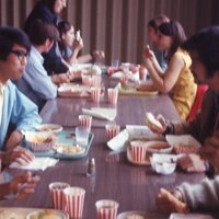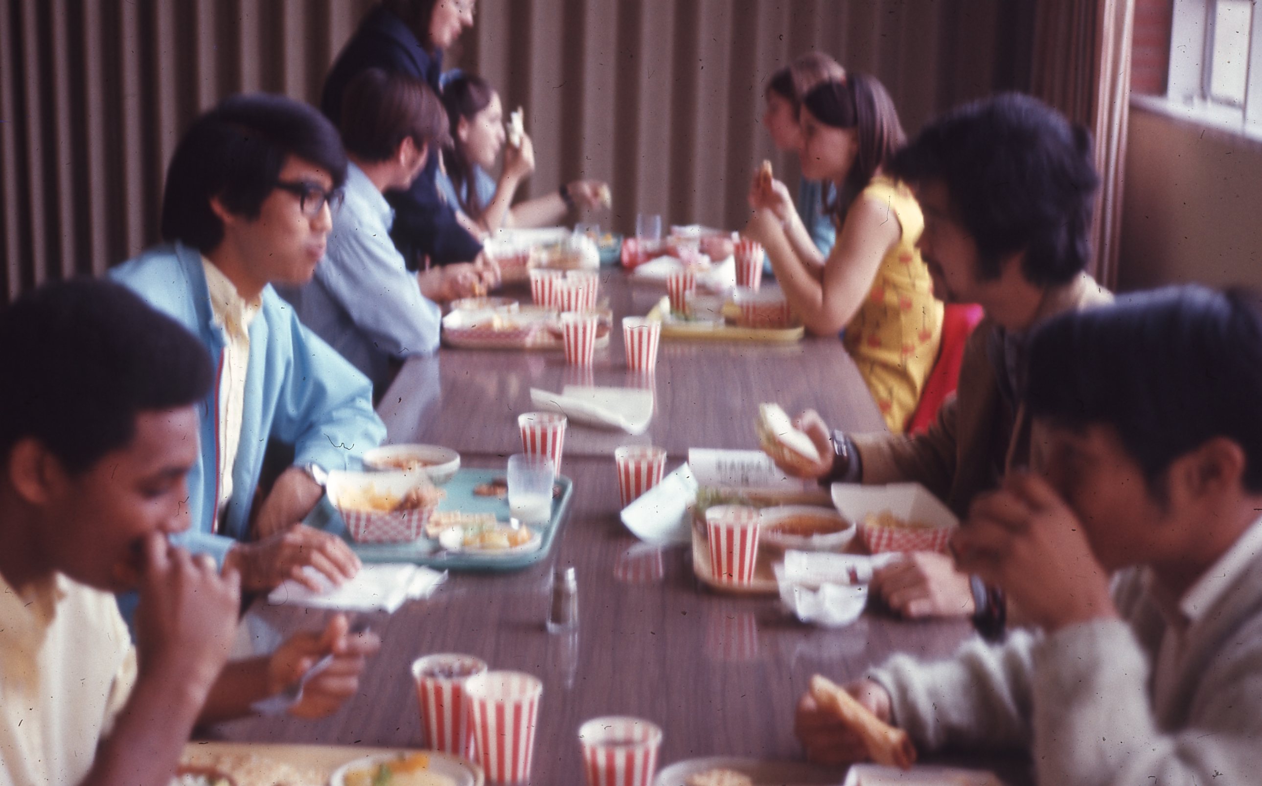 Pacific University students at a Haumana O Hawai'i (Hawaiian Club) event in the fall of 1970. The image is blurry. Three of the students are identified on the original slide as: Guy Nishizawa (Class of 1974); Carl Itamura (Class of 1974); and Sherman Cruz. This photograph was likely taken at the home of Professor Fred Scheller, who lived in Aloha, Oregon. Scheller was an advisor to Haumana O Hawai'i, and appears to have hosted many social events for Hawaiian students around this time period.
