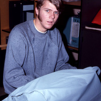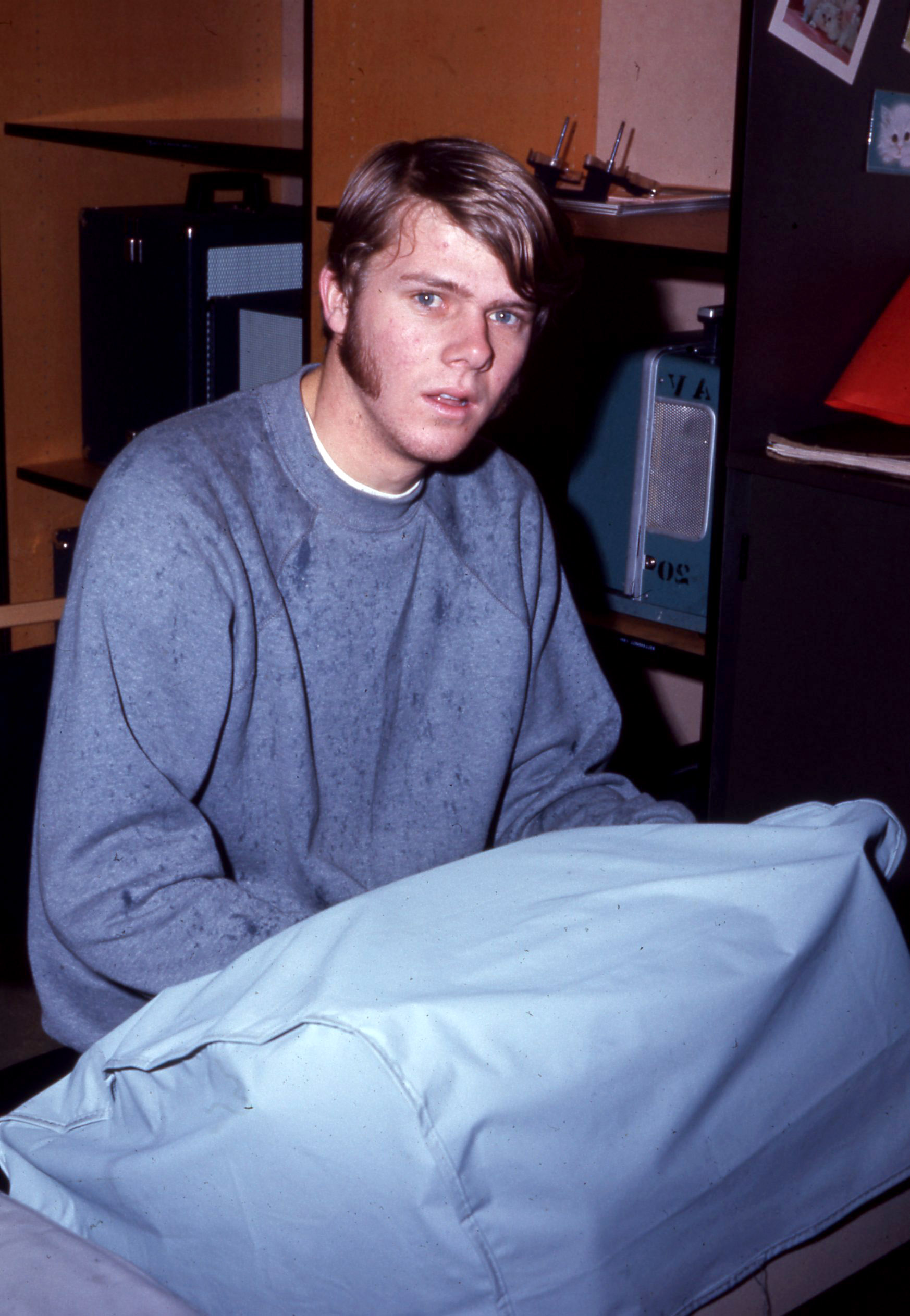 - A male Pacific University student sitting at a typewriter with a dust cover. Various other audio-visual equipment appears in the background. This photograph was taken in December, 1970.