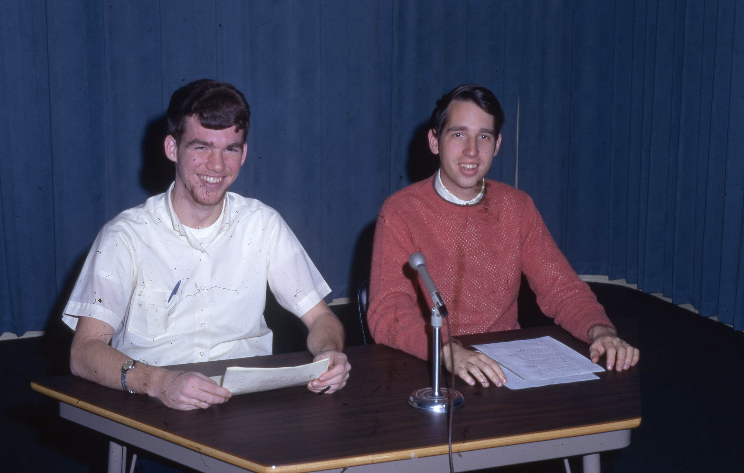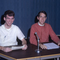 - Two Pacific University students sit at a desk with a microphone, with notes (possibly a script) in front of them. Based on context from other images in the set, this photograph may have been taken during the annual "Wassail" holiday celebration; they may have been announcers. This photograph was taken in December, 1970.