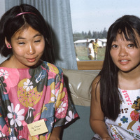 Joey Takahashi and another Pacific University student at a Haumana O Hawai'i (Hawaiian Club) social event, probably in October 1970. This photograph was likely taken at the home of Professor Fred Scheller, who lived in Aloha, Oregon. Scheller was an advisor to Haumana O Hawai'i, and appears to have hosted many social events for Hawaiian students around this time period. The original slide is labeled: "Haw. 1970."