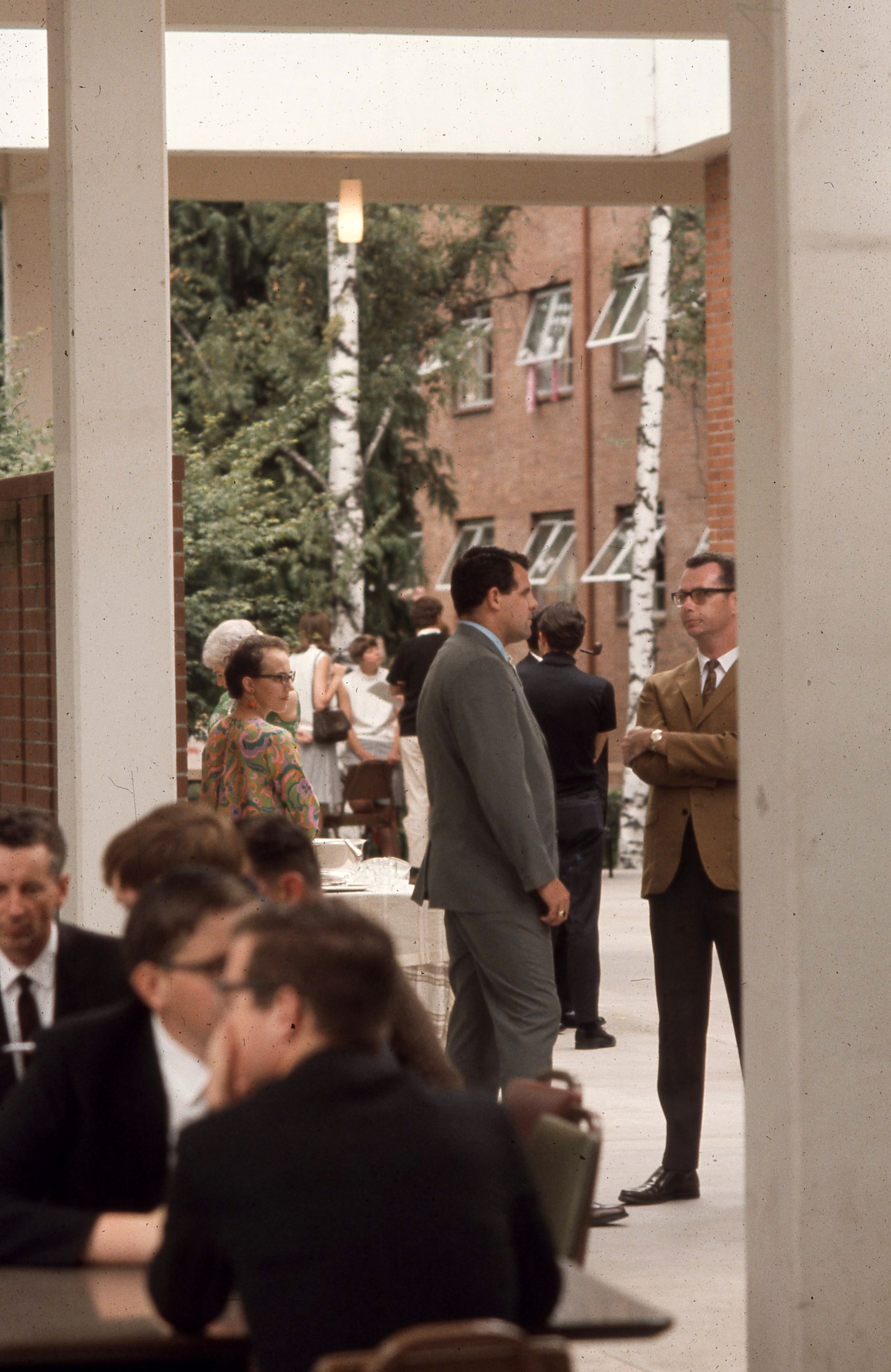 - People who appear to be faculty, students, and/or guests attending an event on the patio of Washburne Hall at Pacific University, circa 1970. Walter Hall appears in the background.