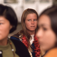 A Pacific University student wearing a red lei, while two other students stand out-of-focus in the foreground. This photograph was likely taken during one of Pacific's annual Lu'au celebrations circa 1970. For a related image, see PUA_LuauSlides_293.