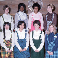 A group portrait of Pacific University women students wearing coordinating outfits. They are wearing name tags, but the names are not legible. The woman wearing green and red plaid on the bottom left is Jill Matsui (Class of 1972); the woman next to her wearing black and blue is Juanita Chang (Class of 1972); the woman wearing pink plaid is Linda Jenkins. This photograph may show the women who were elected to Pacific's Homecoming Court in 1970. Matsui was crowned Homecoming Queen that year, and Jenkins was chosen as the Black Student Union's representative on the Homecoming Court. For two other images taken at the same event, see PUA_LuauSlides_275 and PUA_PeoSlides_112.