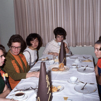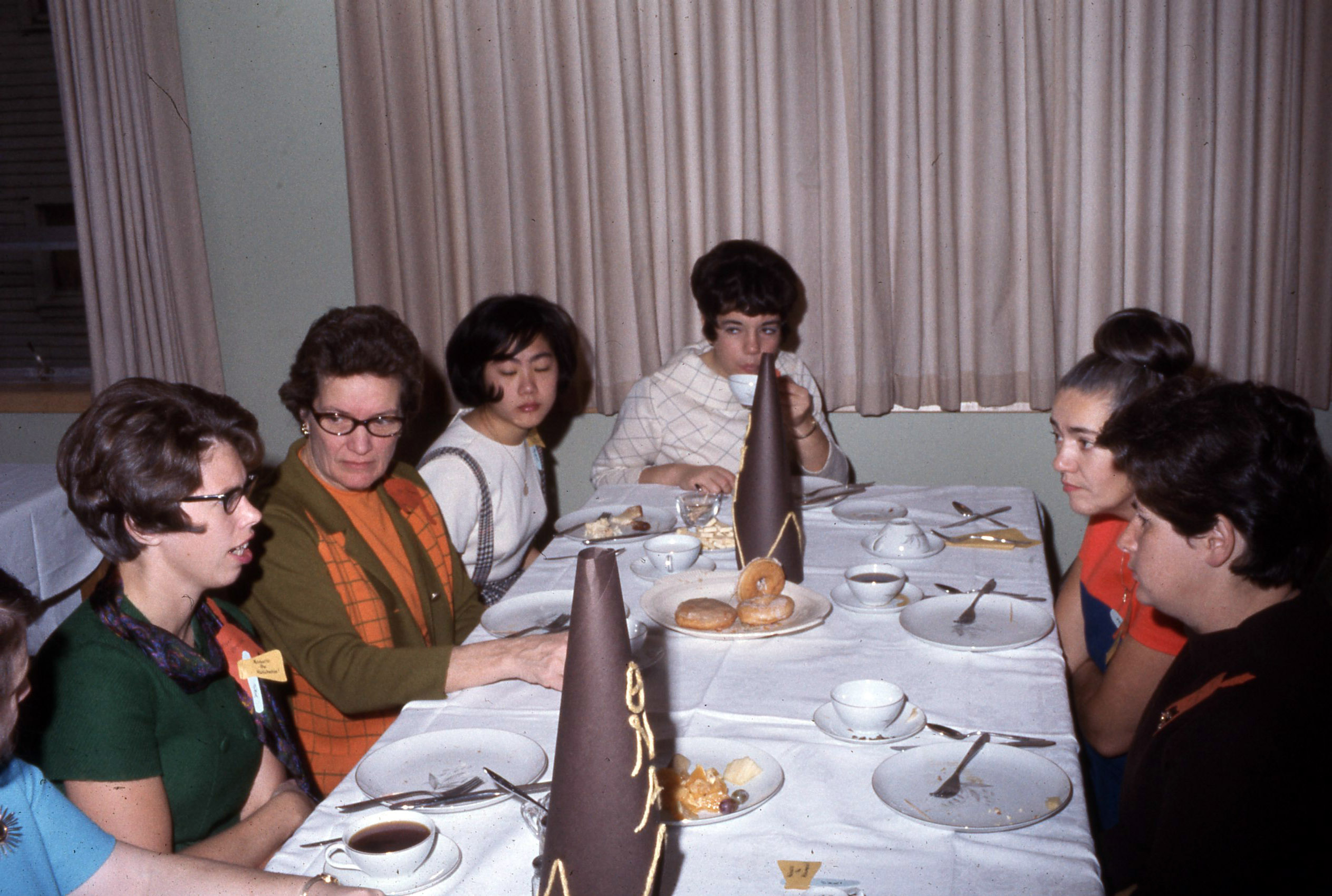 - A meeting of women student members and/or alumni of Pacific University's Theta Nu Alpha sorority. They are drinking coffee, eating pastries and talking around a table. This photograph was likely taken circa 1970.