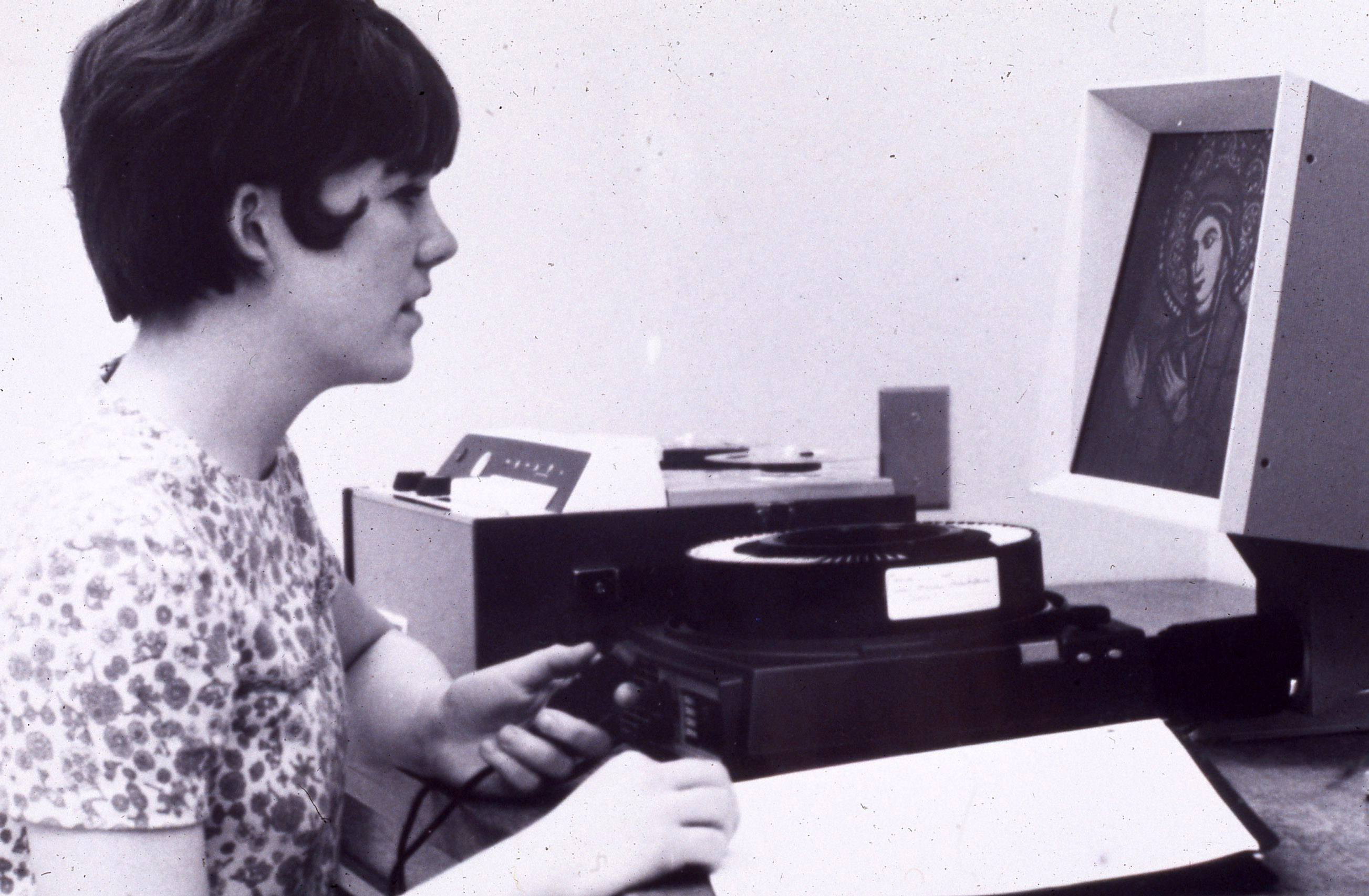 A Pacific University student examining what appears to be a slide for an art history class, using a mechanical slide viewer attached to a slide carousel. A reel-to-reel audio tape player is on the left. This photograph was likely taken circa 1970, and may have been posed for usage in university marketing publications. For another image of the same student, see PUA_PeoSlides_222.