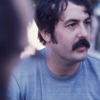 A male student sitting outdoors on Pacific University's campus. Based on other images from the same set, this photograph was taken during an outdoor class session led by English professor Robert Davies. This is one of a set of slides featuring students and faculty of Pacific University, apparently produced by a staff photographer circa 1970 for use in promotional publications. The photographer appears to have intentionally chosen subjects from diverse backgrounds to illustrate student experiences at Pacific. For another view of this scene taken on the same day, see PUA_PeoSlides_143.