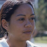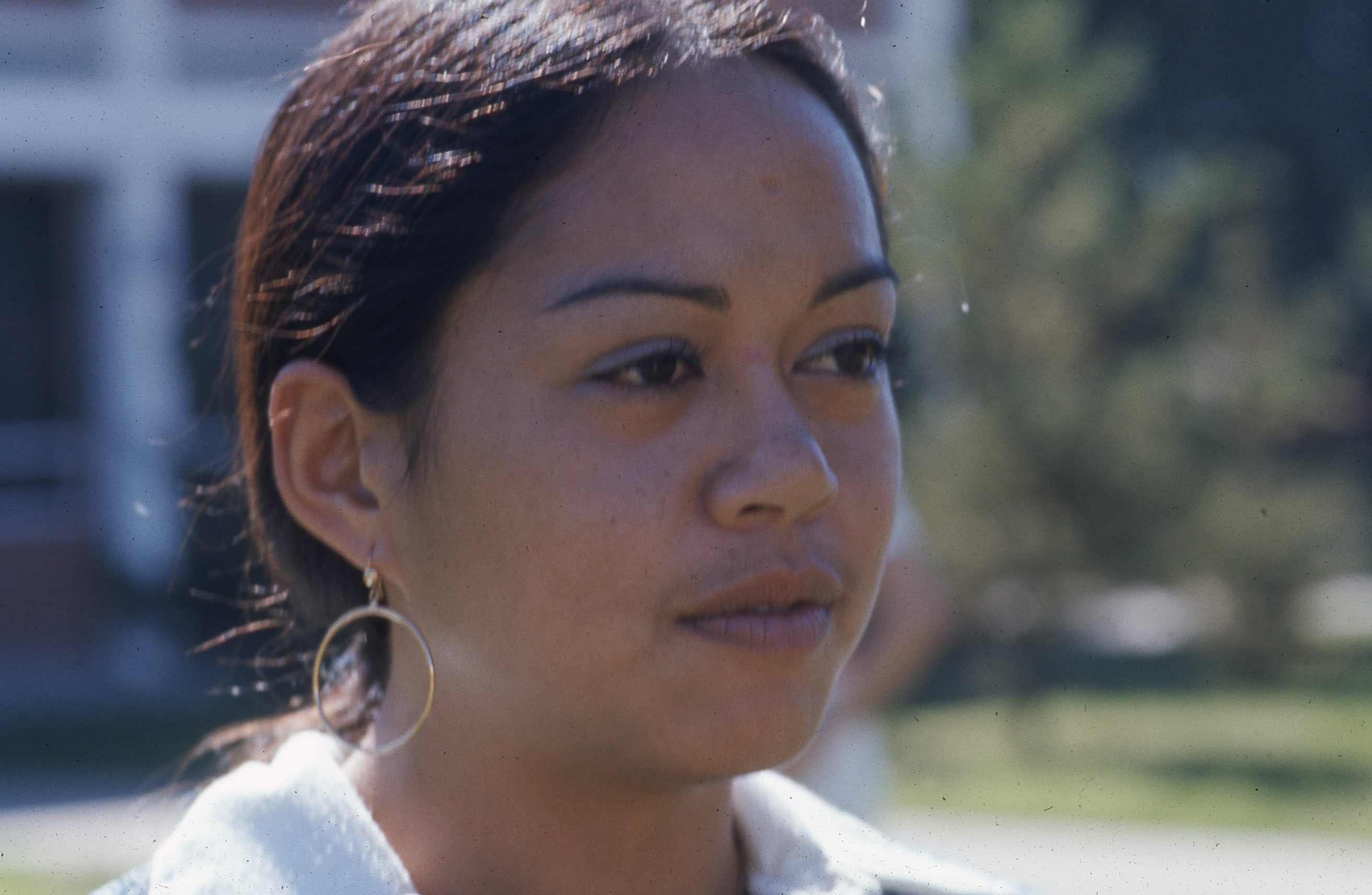 A close-up view of a Pacific University student's face, while she appears to be watching something. This is one of a set of slides featuring students and faculty of Pacific University, apparently produced by a staff photographer circa 1970-1974 for use in promotional publications. The photographer appears to have intentionally chosen subjects from diverse backgrounds to illustrate student experiences at Pacific.