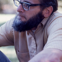 Pacific University professor Robert Davies, who taught English, conducting a class outdoors. This is one of a set of slides featuring students and faculty of Pacific University, apparently produced by a staff photographer circa 1970 for use in promotional publications. The photographer appears to have intentionally chosen subjects from diverse backgrounds to illustrate student experiences at Pacific. For another view of Davies and his class taken on the same day, see PUA_PeoSlides_143.