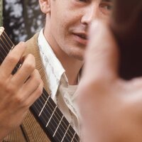 A student playing a stringed instrument, with another student's hand artistically blurred in the foreground. This is one of a set of slides featuring students and faculty of Pacific University, apparently produced by a staff photographer circa 1970-1974 for use in promotional publications. The photographer appears to have intentionally chosen subjects from diverse backgrounds to illustrate student experiences at Pacific.