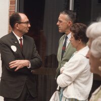 Pacific University's President Miller Ritchie, standing outside on Pacific's campus with several other people: possibly the parents of students. The original slide is labeled, "Reception." This appears to have been taken on the patio of Washburne Hall. Miller served as President from 1959-1970. This photograph was likely taken circa 1968-1970.