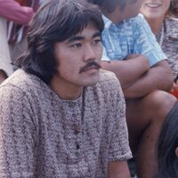 Students sitting outdoors on risers, possibly at a sports event. The student in the center of the image is gazing forward. This is one of a set of slides featuring students and faculty of Pacific University, apparently produced by a staff photographer circa 1970-1974 for use in promotional publications. The photographer appears to have intentionally chosen subjects from diverse backgrounds to illustrate student experiences at Pacific. For another view of the same scene, see: PUA_PeoSlides_131