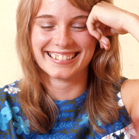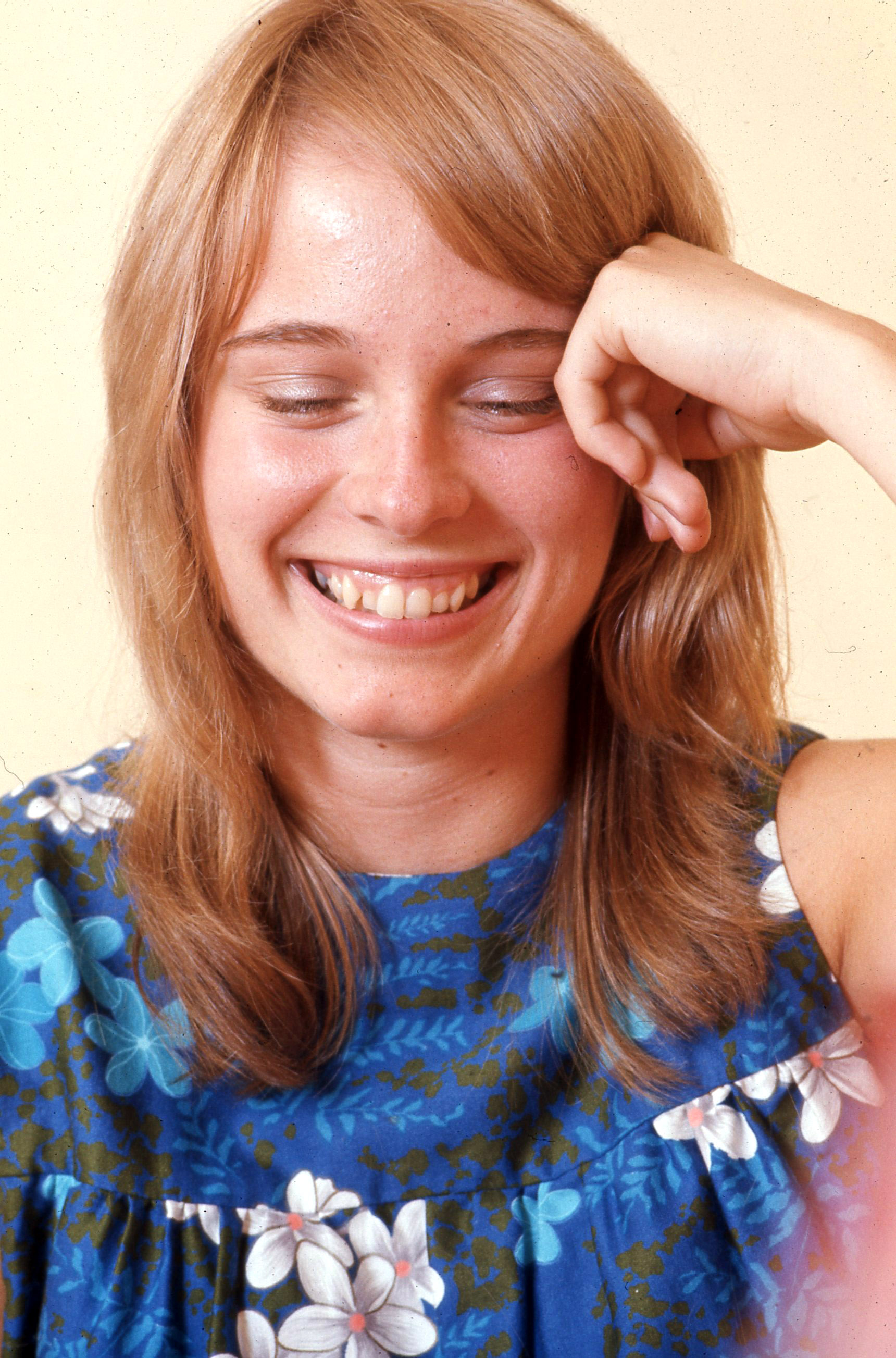 A close-up view of a laughing Pacific University woman student with red hair and a vibrant blue floral top, laughing. Based on other images that came from the same set, this was taken during a class on Pacific's campus. This is one of a set of slides featuring students and faculty of Pacific University, apparently produced by a staff photographer circa 1970-1974 for use in promotional publications. The photographer appears to have intentionally chosen subjects from diverse backgrounds to illustrate student experiences at Pacific.
