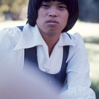 A student who appears to be Latino (but might be of another background), sitting outdoors on Pacific University's campus. Based on other images from the same set, this photograph was taken during an outdoor class session led by English professor Robert Davies. This is one of a set of slides featuring students and faculty of Pacific University, apparently produced by a staff photographer circa 1970 for use in promotional publications. The photographer appears to have intentionally chosen subjects from diverse backgrounds to illustrate student experiences at Pacific. For another view of this scene taken on the same day, see PUA_PeoSlides_143; for another view of this student, see PUA_PeoSlides_125.