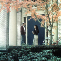 - A student and a professor talking at the entrance to Pacific University's Carnegie Hall. This image appears to have been taken in the 1970s.