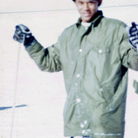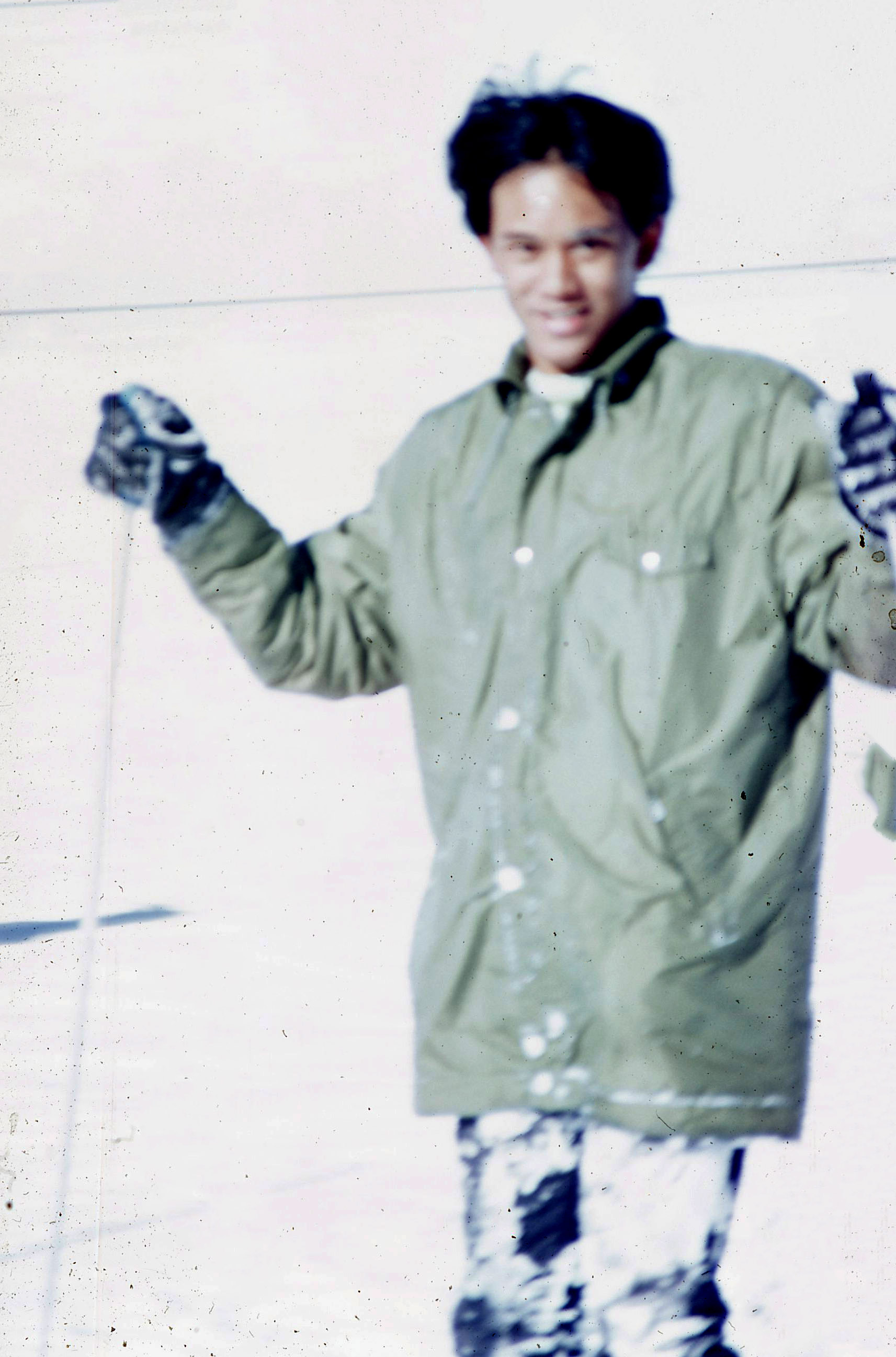 - A Pacific University student wearing a green coat, on a ski trip to Mount Hood in February, 1971. This appears to have been part of an annual trip organized by Pacific's Haumana O Hawai'i (Hawaiian Club), led by Professor Fred Scheller. The original image is overexposed and slightly blurry.