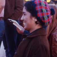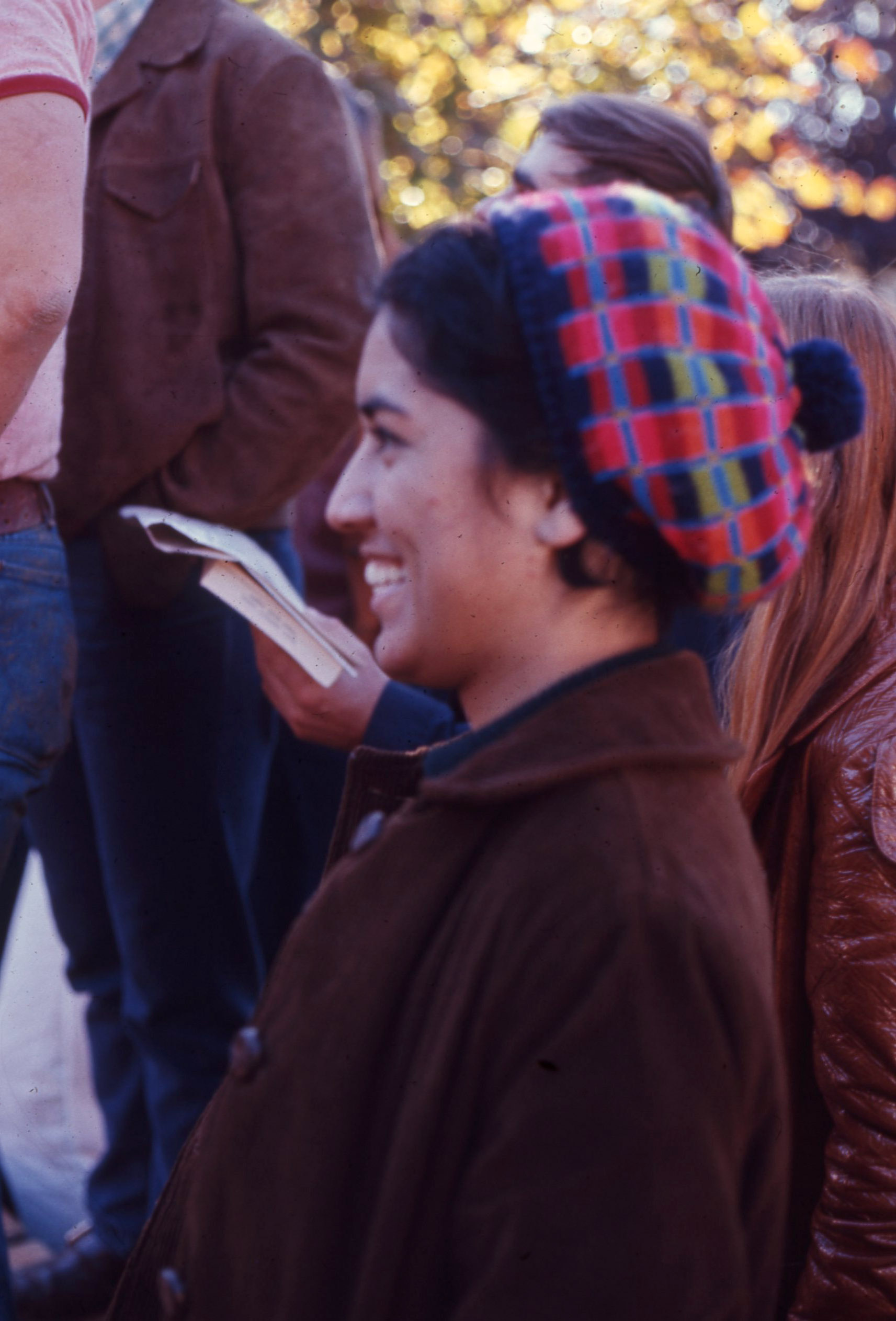 - Pacific University student Colleen Keliikoa wearing a hat while standing outdoors with other students. This image was part of a set of slides that all relate to the activities of Pacific's Haumana O Hawai'i (Hawaiian Club). The original slide was printed in November, 1971.