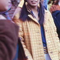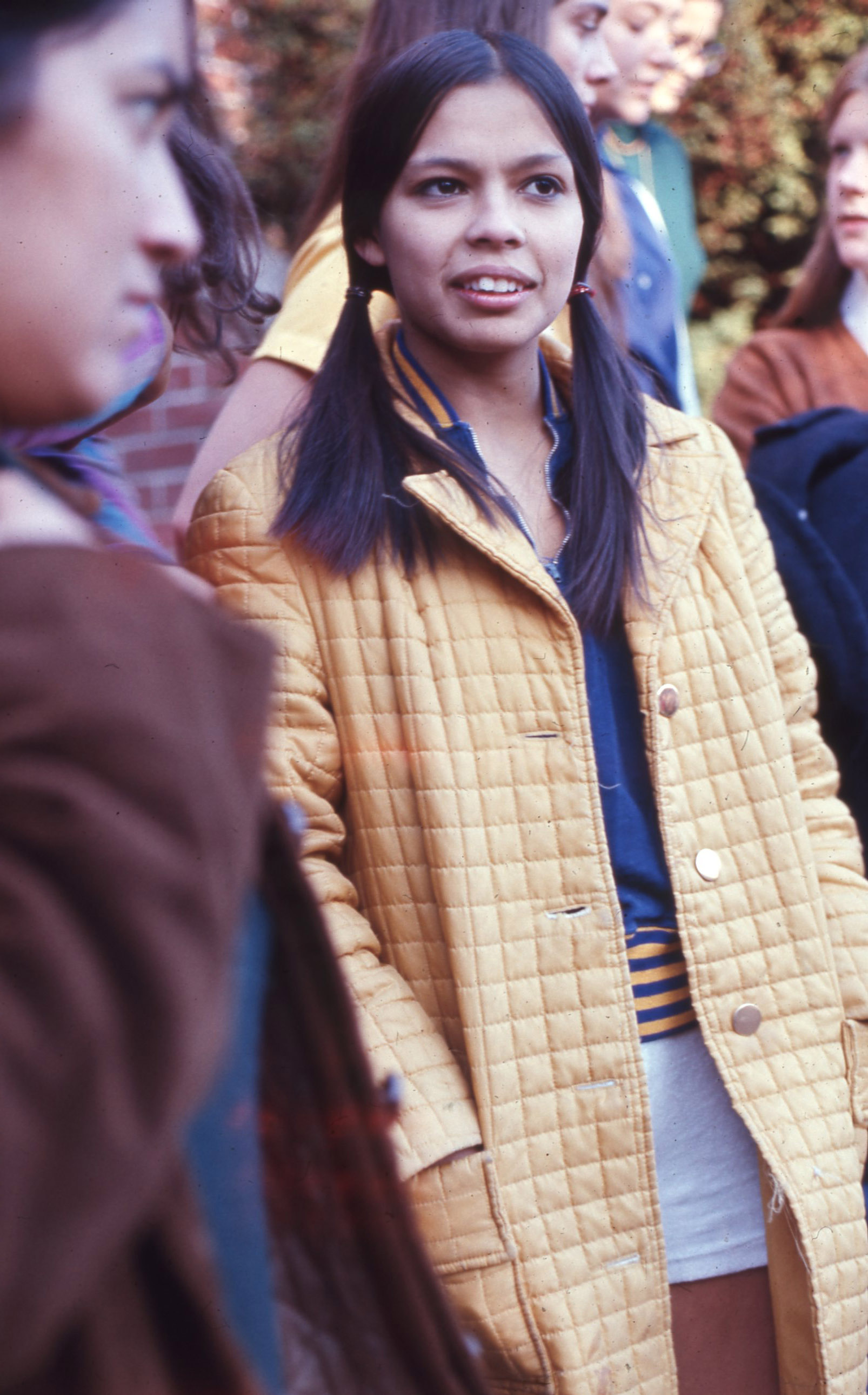 - A Pacific University student identified by a handwritten note as "Sherry," standing outdoors with other students. This image was part of a set of slides that all relate to the activities of Pacific's Haumana O Hawai'i (Hawaiian Club). The original slide was printed in November, 1971.
