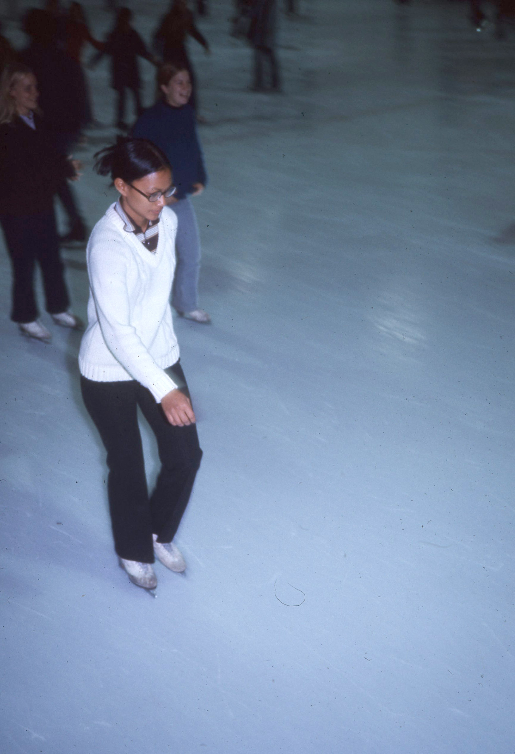- A Pacific University student, identified on the original slide as Shirley Valdez, at an ice skating rink. This appears to have been taken during an outing of Haumana O Hawai'i (Hawaiian Students Club) in December 1971. It was most likely taken at the Beaverton Ice Center.