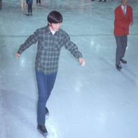 A Pacific University student, identified on the original slide as "Brian Mastomota," at an ice skating rink. A note on the original slide spells his last name as "Matomoto" then crosses it out and respells it "Mastomota;" it is possible that his name was the more common spelling, "Matsumoto." This appears to have been taken during an outing of Haumana O Hawai'i (Hawaiian Students Club) in December 1971. It was most likely taken at the Beaverton Ice Center.