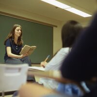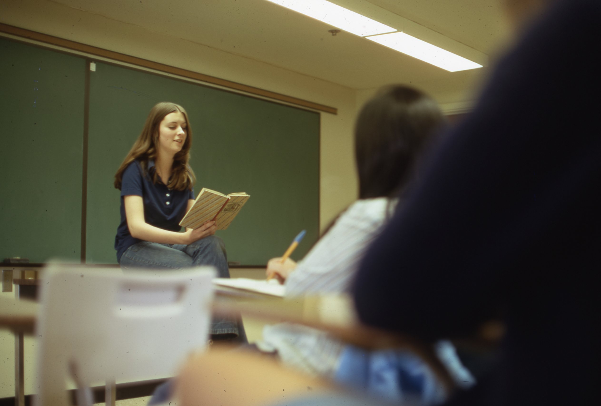 - A woman, presumably a Pacific University student, sitting on a table and reading from a book in front of a class. This photograph was taken by David Thompson, who may have been a staff photographer. The original slide was printed in May 1972.