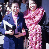 - Student Faith Nagasawa dressed in a graduation robe wearing a large number of pink leis, just after Pacific University's Commencement in May, 1973. The woman standing with her is likely a relative; possibly her mother.