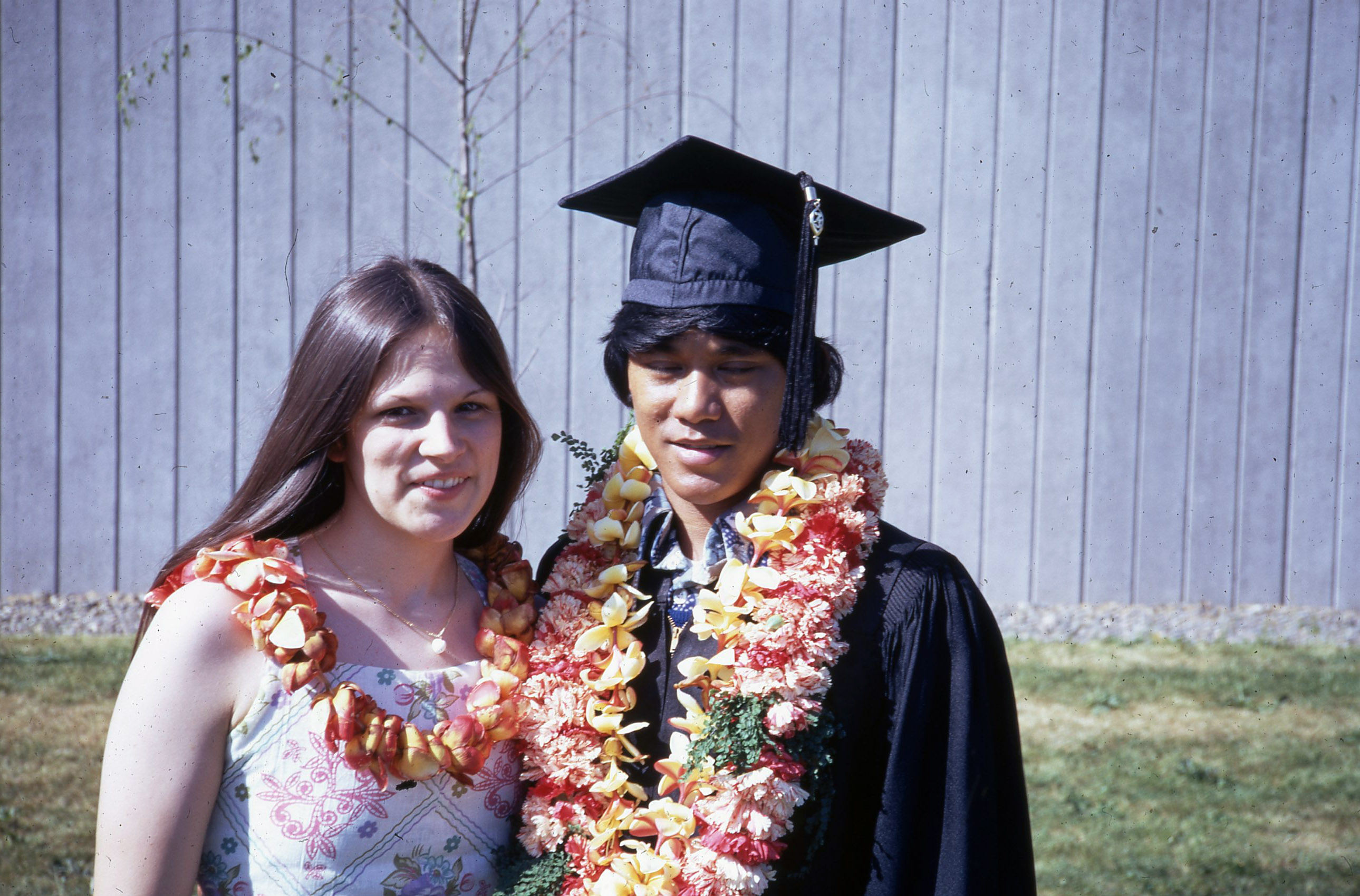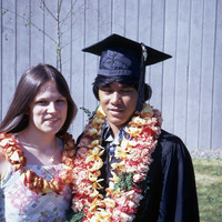 - Two students wearing leis during Commencement in May, 1973 at Pacific University.