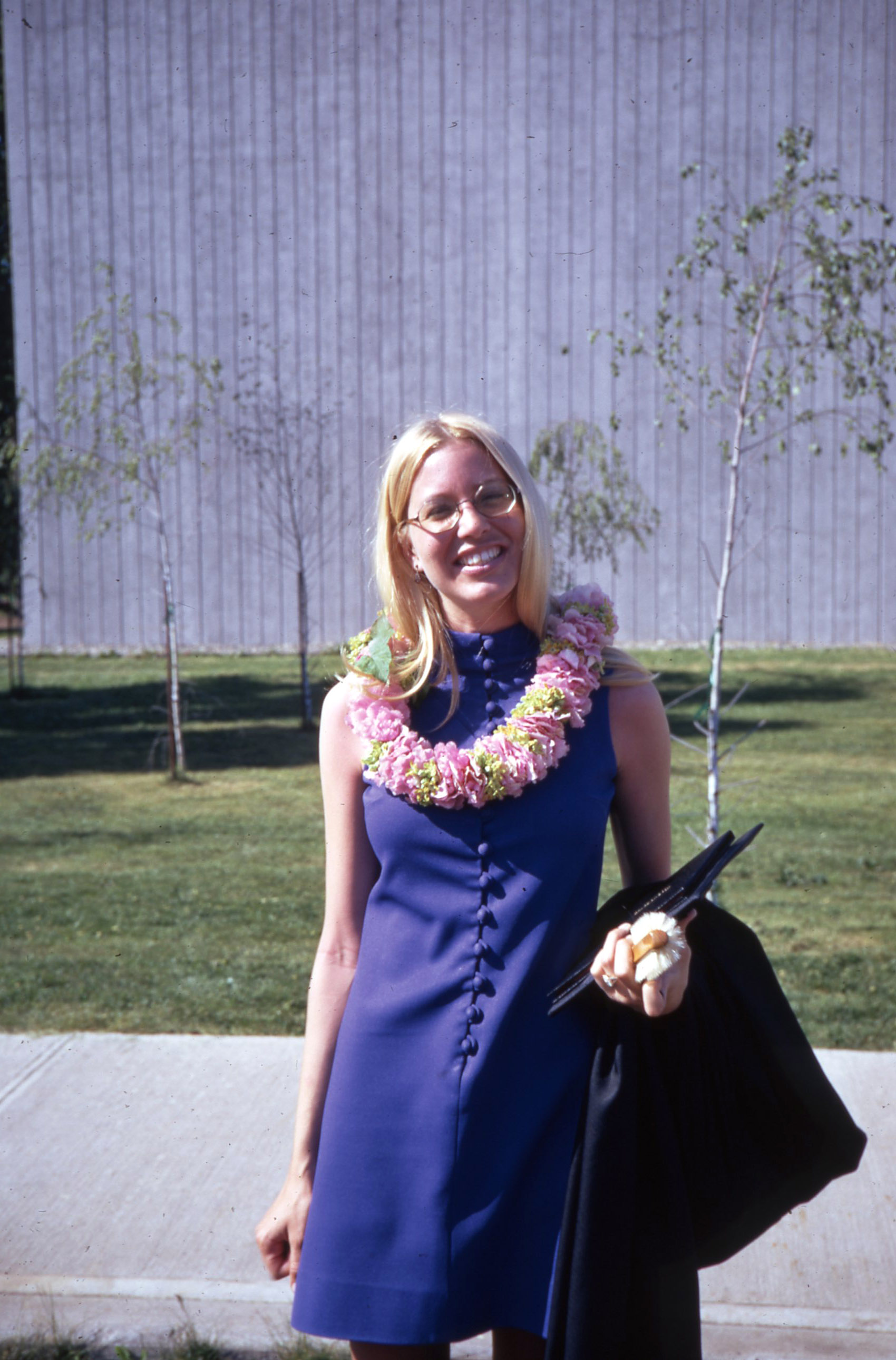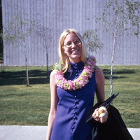 - A student wearing a lei who appears to have just graduated, during Pacific University's Commencement in May, 1973. She is holding her robe, tam and diploma.