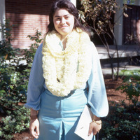 - A student wearing multiple large, white leis who appears to have just graduated, during Pacific University's Commencement in May, 1973.