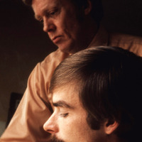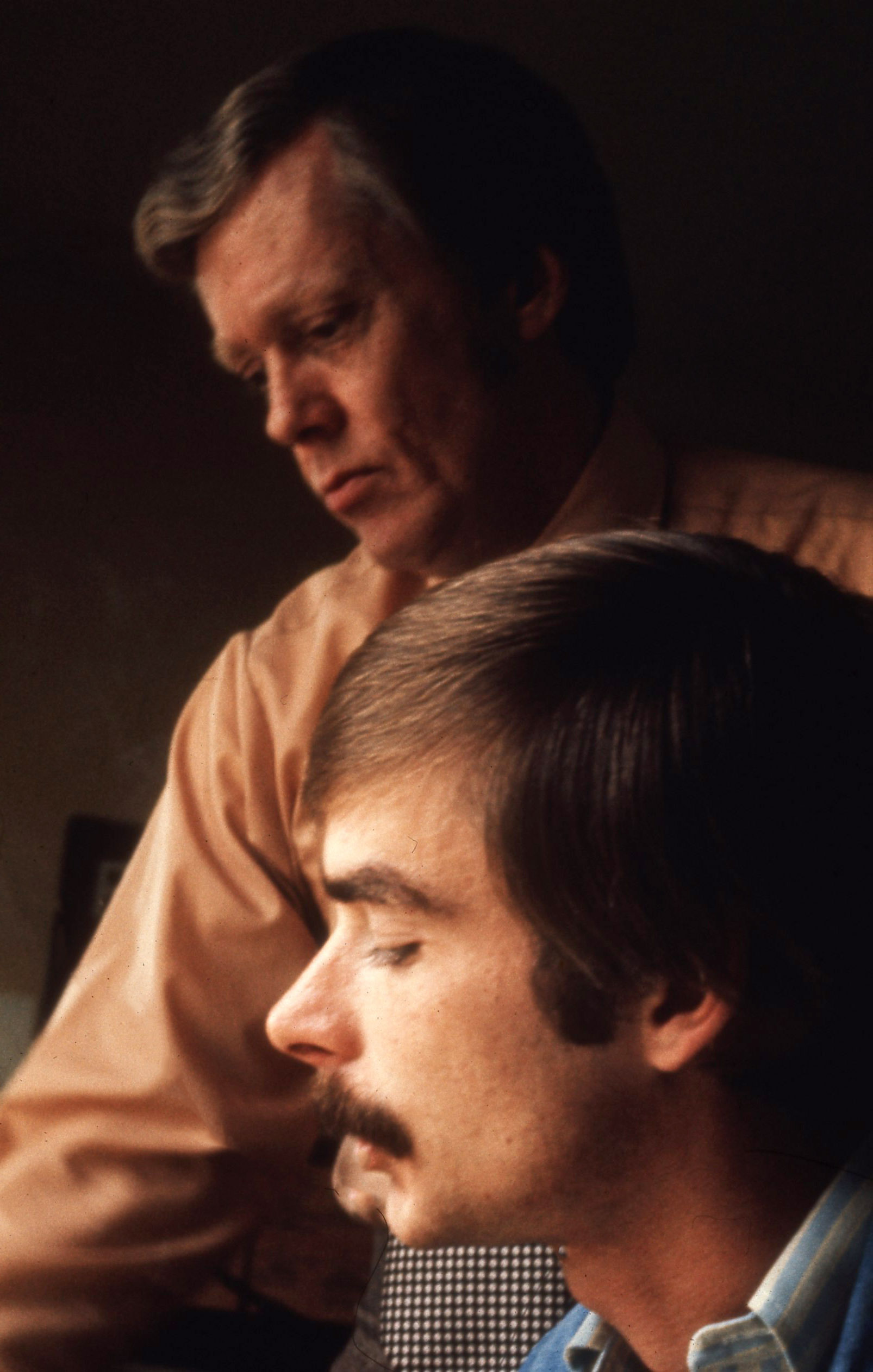 Two men, possibly a student and a professor, apparently examining something together while at Pacific University. Based on similar images found together with this one, this was likely taken by a staff photographer in the early 1970s. The slide was printed in March 1976, but was most likely a reprint of an earlier photograph.
