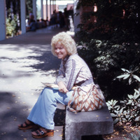 - A woman with blond hair holding several folders, sitting on the patio of Washburne Hall on the Pacific University campus. This photograph was taken by Peg Oslund. The original slide was printed in September, 1976.