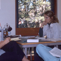 Women seated what appears to be a break room at Pacific University. They may be staff members, or possibly a professor (left) with students. Coffee supplies are in the background; notes, magazines and a book are on the table. The notice posted on the wall behind them is written phonetically, and appears to be asking people to bring replacement supplies or "goodies" to the room. The original slide was printed in October, 1976.