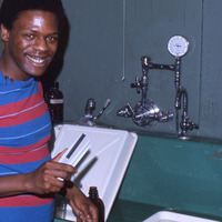 - A student working in what appears to be Pacific University's photography lab or darkroom. He is holding a tool, possibly for working with negatives. Plastic film canisters, measurement tubes, trays, chemicals, wires for drying prints and a sink appear behind the student. The original slide was printed in October, 1976.