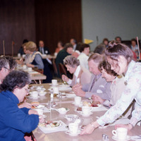 Several tables of people, most likely parents of Pacific University students, eating a luncheon in the MPR (Multi-Purpose Room) of Washburne Hall. This was likely taken during Parent's Weekend; possibly at a Parent-Faculty luncheon that took place on Apr. 16, 1977, several hours before Pacific University's annual Lu'au. One women in the background is wearing a lei. The original slide was printed in April 1977.