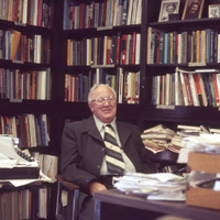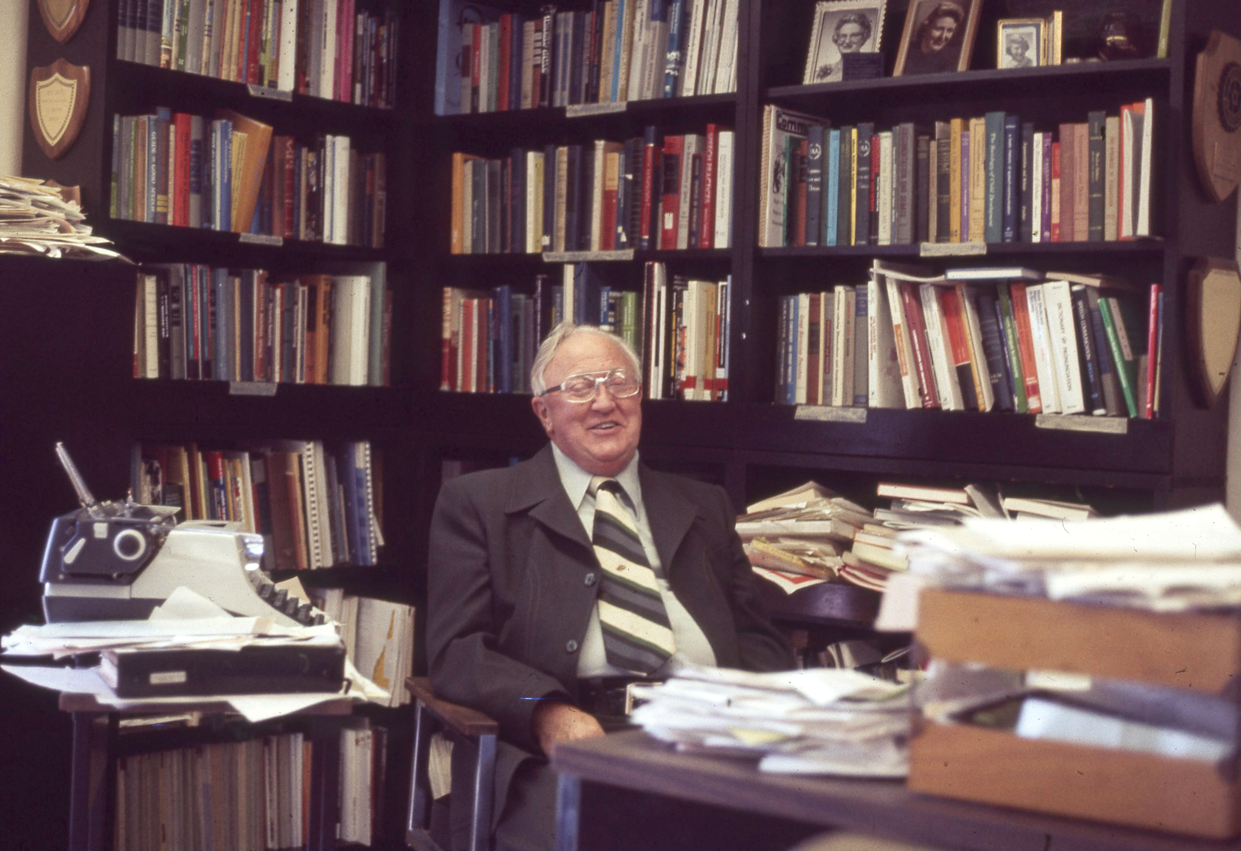 Dr. Albert "Hap" Hingston, a Speech professor at Pacific University, in his office. A typewriter and many papers are spread across his desk, while a shelf packed with books appears behind him. The original slide, which was printed in May 1977, is labeled "M. Scott". According to the university's student newspaper, Mike Scott won third place in a color slide contest that was held in that month, sponsored by Pacific's Admissions Office. The theme was to illustrate "campus activities or university related events" (The Index, May 13, 1977, p. 2).