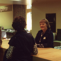 A view of the Registrar's Desk in Marsh Hall at Pacific University in 1977. The woman behind the desk is the University Registrar, Gloria Wulf. The man on the left is former University President Miller Ritchie, who served from 1959-1970. Ritchie continued to be involved as a volunteer and supporter of Pacific after retiring. The woman in the center of the image may be his wife, Josephine Miller. At the time that this photograph was taken, Marsh Hall had just reopened after a renovation, following a fire that had ruined the original interior in 1975. The original slide was printed in September, 1977.