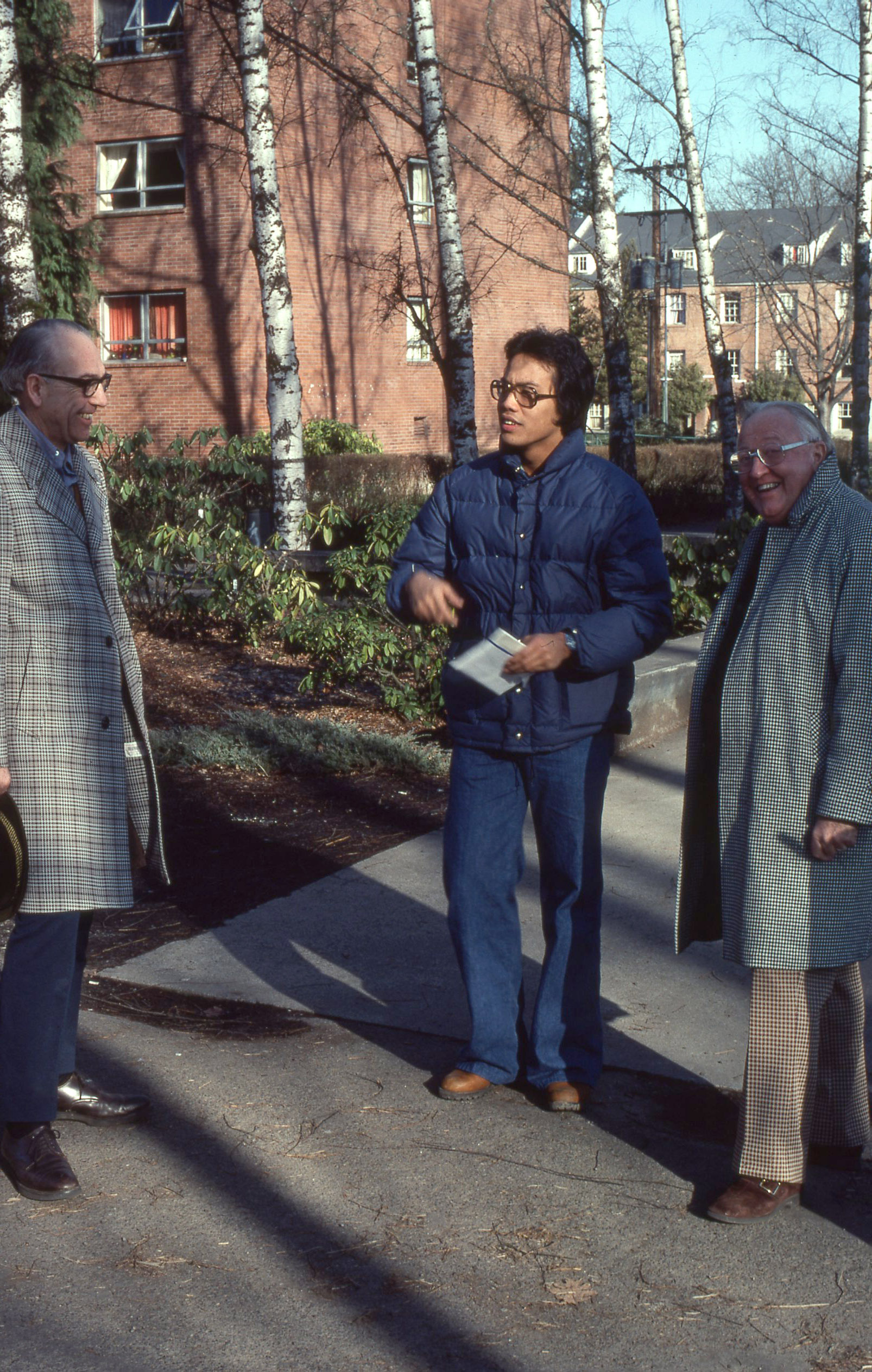 Professor Fred Scheller (left) with a student (center) and another man who is most likely Professor Albert "Hap" Hingston (right), on Pacific University's campus. Both Professors taught Speech and Communications at Pacific. Walter Hall appears behind them on the left; McCormick Hall is in the background. The original slide was printed in March 1978.