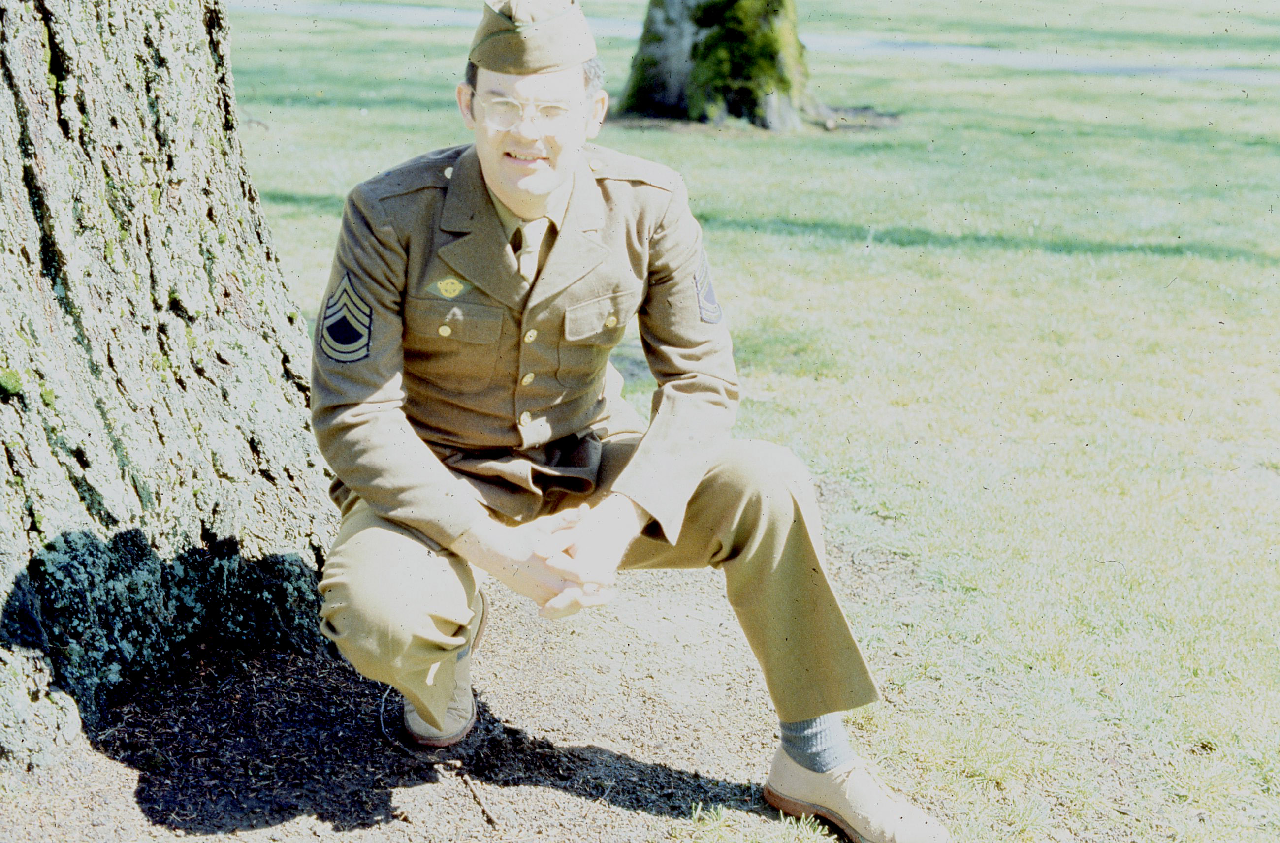 A man wearing a U.S. Army uniform with Sergeant First Class insignia, posing on what appears to be Pacific University's campus. He may have been a Pacific University alumnus. The original slide was printed in April 1978. This photograph was also printed in Pacific's 1977-78 yearbook at the beginning of the "Seniors Graduation" section.