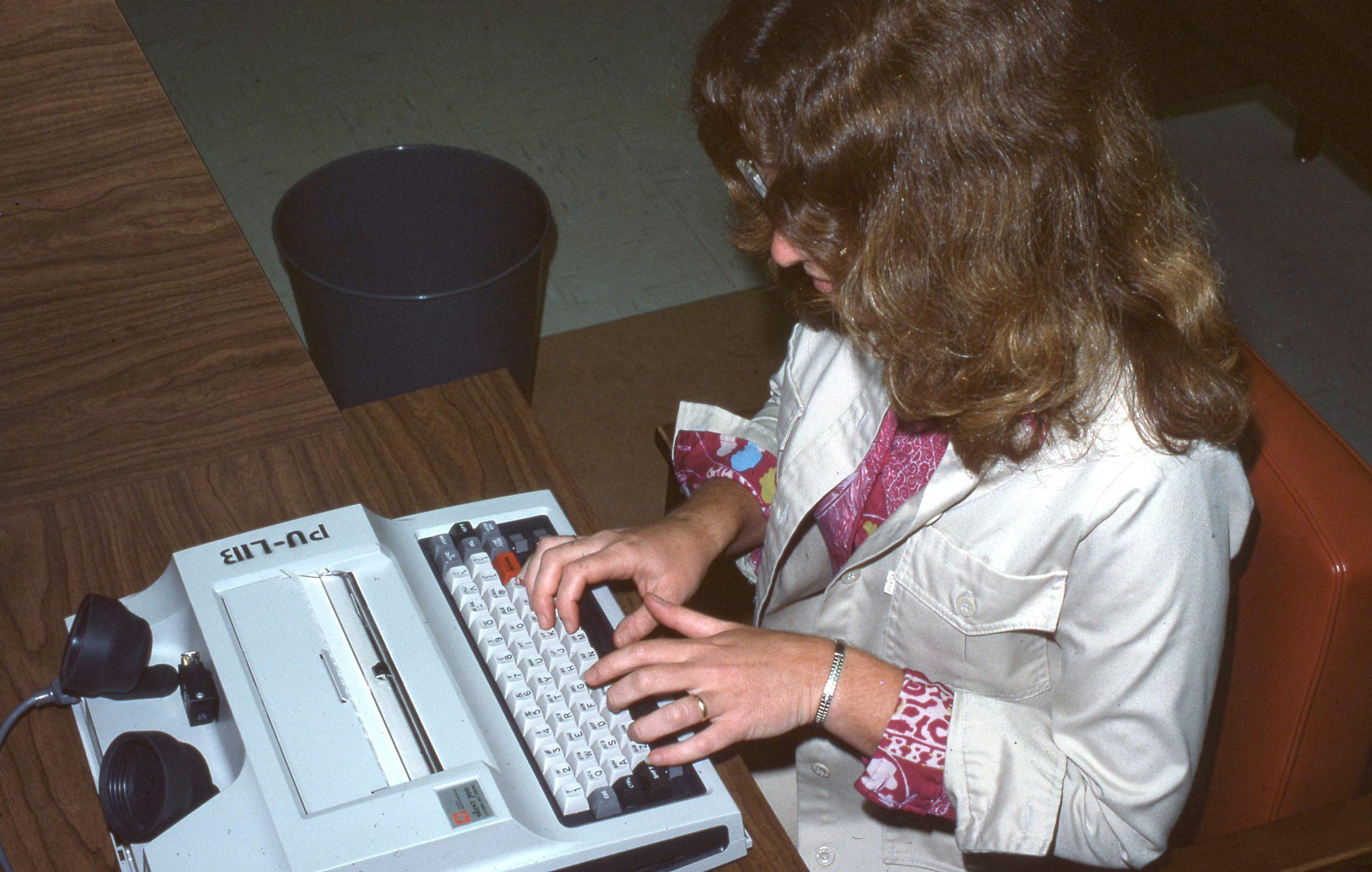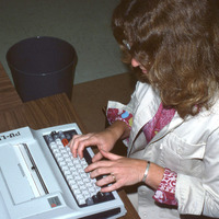 A woman, probably a Librarian, operating a Texas Instruments Silent 700 machine in an Pacific University office. This was an early keyboard interface device for connecting to computer systems. The cup-shaped objects at the back of the machine were an acoustic coupler, used for transmitting data over telephone lines by attaching a telephone receiver. The original slide was printed in July, 1978. This is one of a set of photographs that appears to have been posed in order to demonstrate the range of work that was taking place in the library.