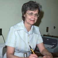 - A woman, probably a librarian (possibly Mary Ann Mellbye?), working in Pacific University's Scott Library in July, 1978. An IBM electric typewriter is in the background. This is one of a set of photographs that appears to have been posed in order to demonstrate the range of work that was taking place in the library.