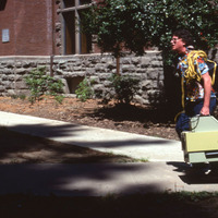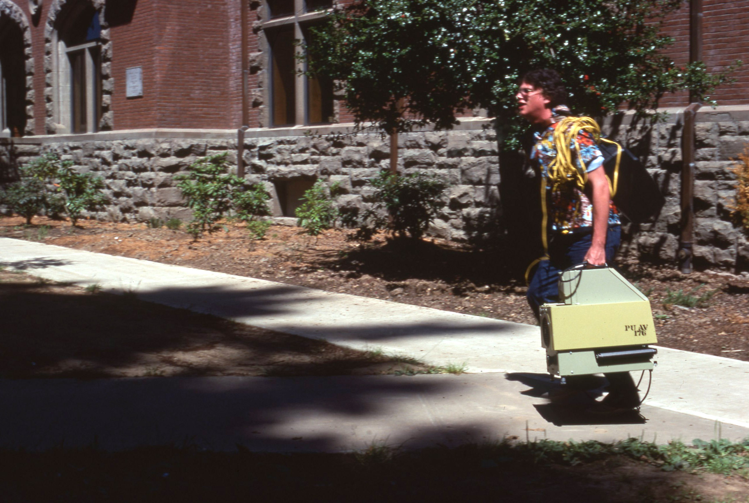 A man, probably a Pacific University student worker, carrying a heavy projector and cables across Pacific's campus. Marsh Hall appears in the background. This is one of a set of photographs that appears to have been posed in order to demonstrate the range of work that was taking place in the audio-visual department of Pacific University.