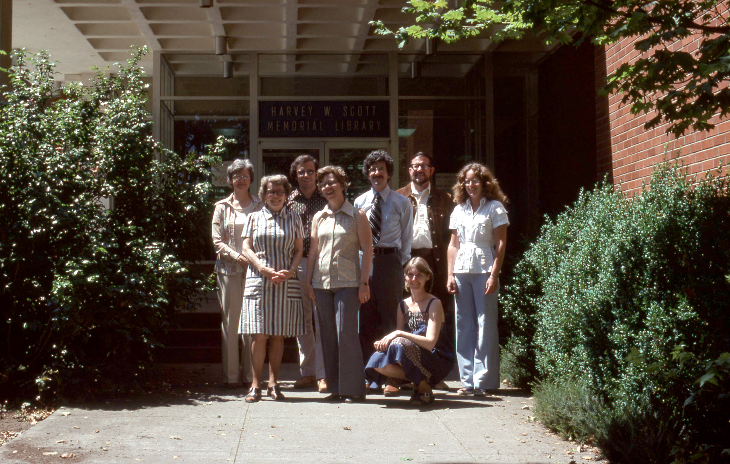 A group portrait of the staff of Pacific University's Scott Memorial Library in July, 1978. They are standing just outside the entrance to the library. Librarians and/or support staff pictured here include: Mary Ann Mellbye (tentatively identified, back row, farthest left); Alex Toth (back row, second from left); Charles Kemp (back row, farthest right); Alice Wilson (tentatively identified, front row, farthest left); and Helen Dugdale (tentatively identified, front row center). This is one of a set of photographs that appears to have been posed in order to demonstrate the range of work that was taking place in the library.