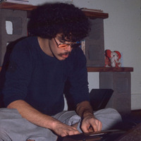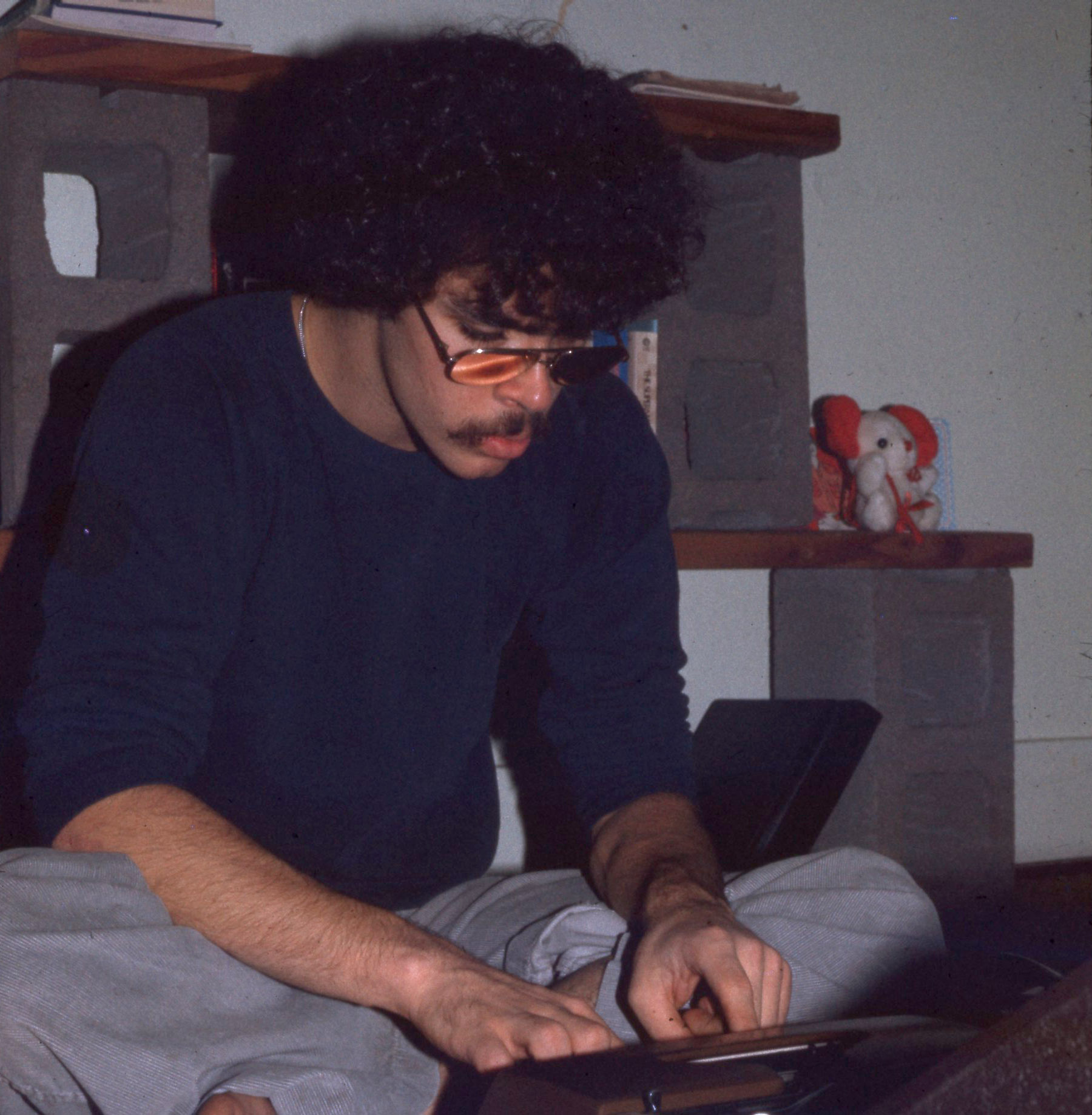 - A man, probably a Pacific University student although he could be faculty, typing on a typewriter. He is wearing glasses and appears to be barefoot. He is seated in front of shelves made of cinder blocks that have textbooks and a small stuffed animal sitting on them. The original slide was printed in March, 1979.