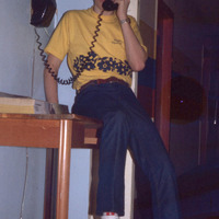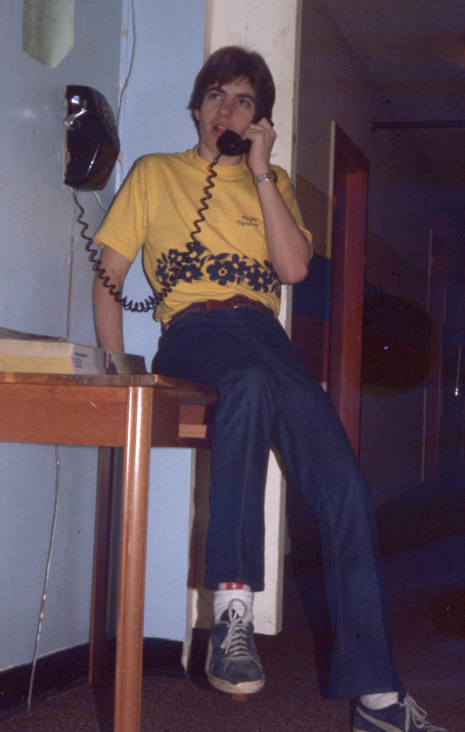 Brad Breland (Pacific University Class of 1982) using a rotary phone in the hallway of a campus building, most likely one of the men's dormitories -- possibly Clark Hall. This was taken in early 1979, when he was likely a sophomore. He is wearing a yellow Hawaiian-themed Pacific University t-shirt and blue-and-white sneakers.