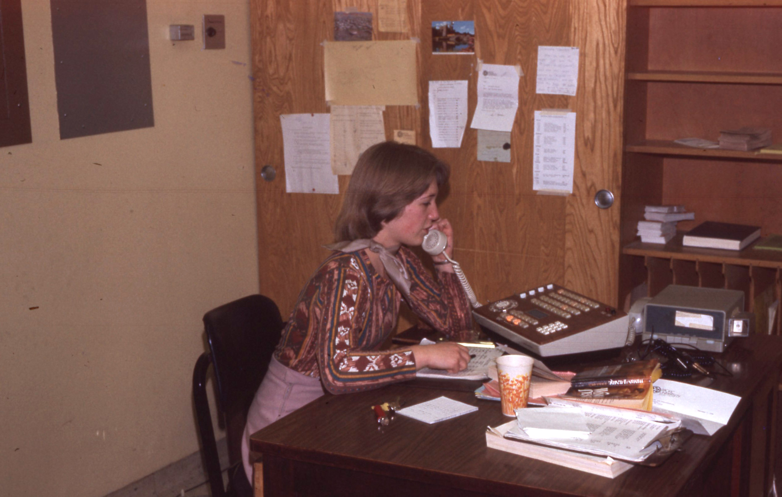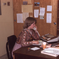 - A woman staff member at Pacific University operating what appears to be a telephone switchboard, or possibly Public Address (PA) system, in a campus office. The original slide was printed in February, 1979.