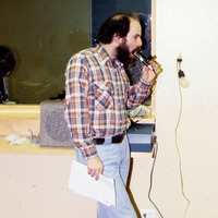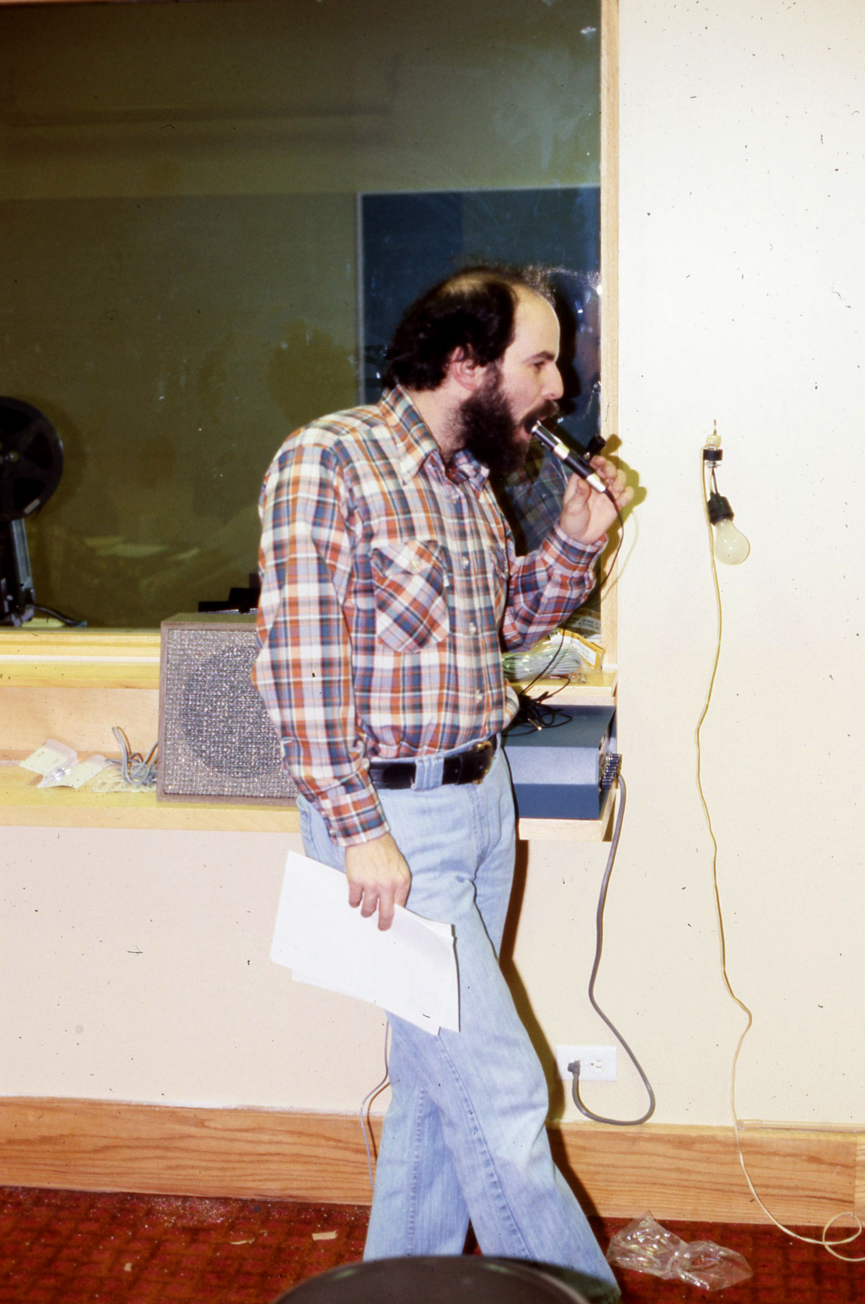 - A man, probably a member of Pacific University's staff or faculty, with a microphone inside his mouth. This appears to have been taken in an office on campus; possibly in Marsh Hall based on the carpet and trim. The original slide was printed in February, 1979.
