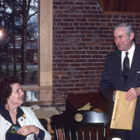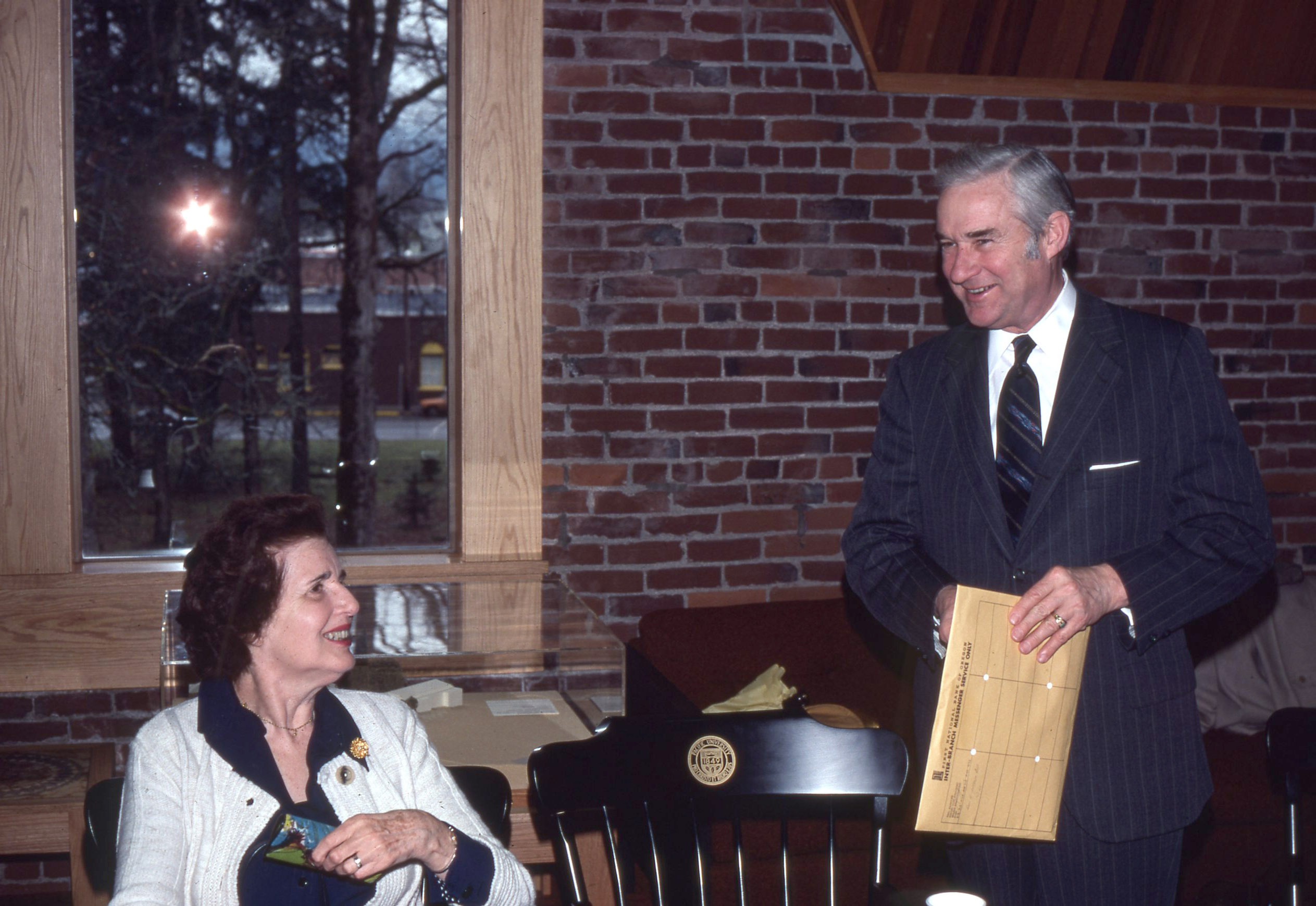 - A man and a woman attending a Pacific University Board of Trustees meeting on the third floor of Marsh Hall. A display case that may contain an architectural model sits behind them. This is one of a set of photographs that were all taken during the same meeting. The original slide was printed in March, 1979.