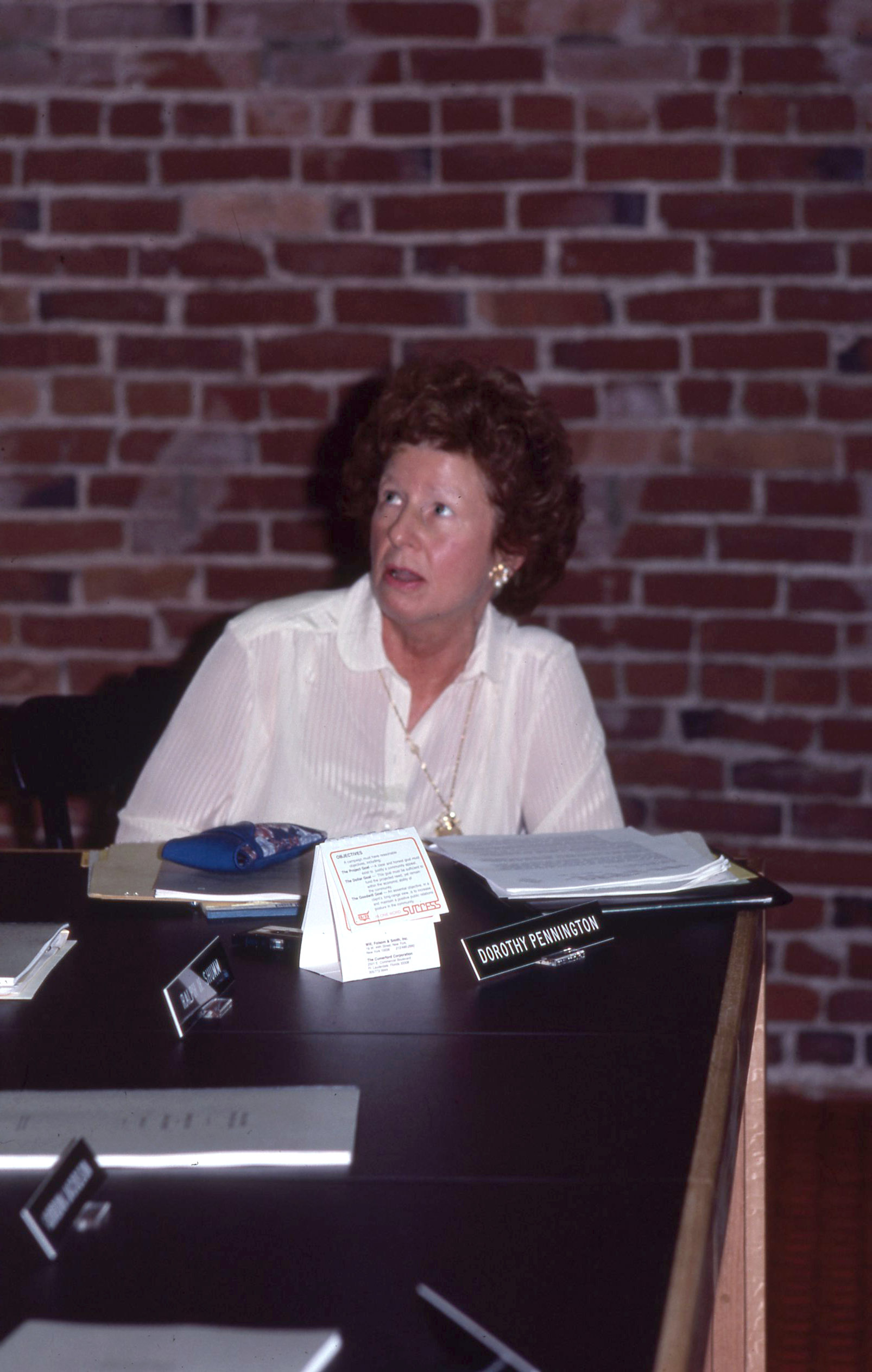 - Dorothy Pennington, Secretary of Pacific University's Board of Trustees, attending a Trustees meeting on the third floor of Marsh Hall. This is one of a set of photographs that were all taken during the same meeting. The original slide was printed in March, 1979.