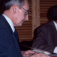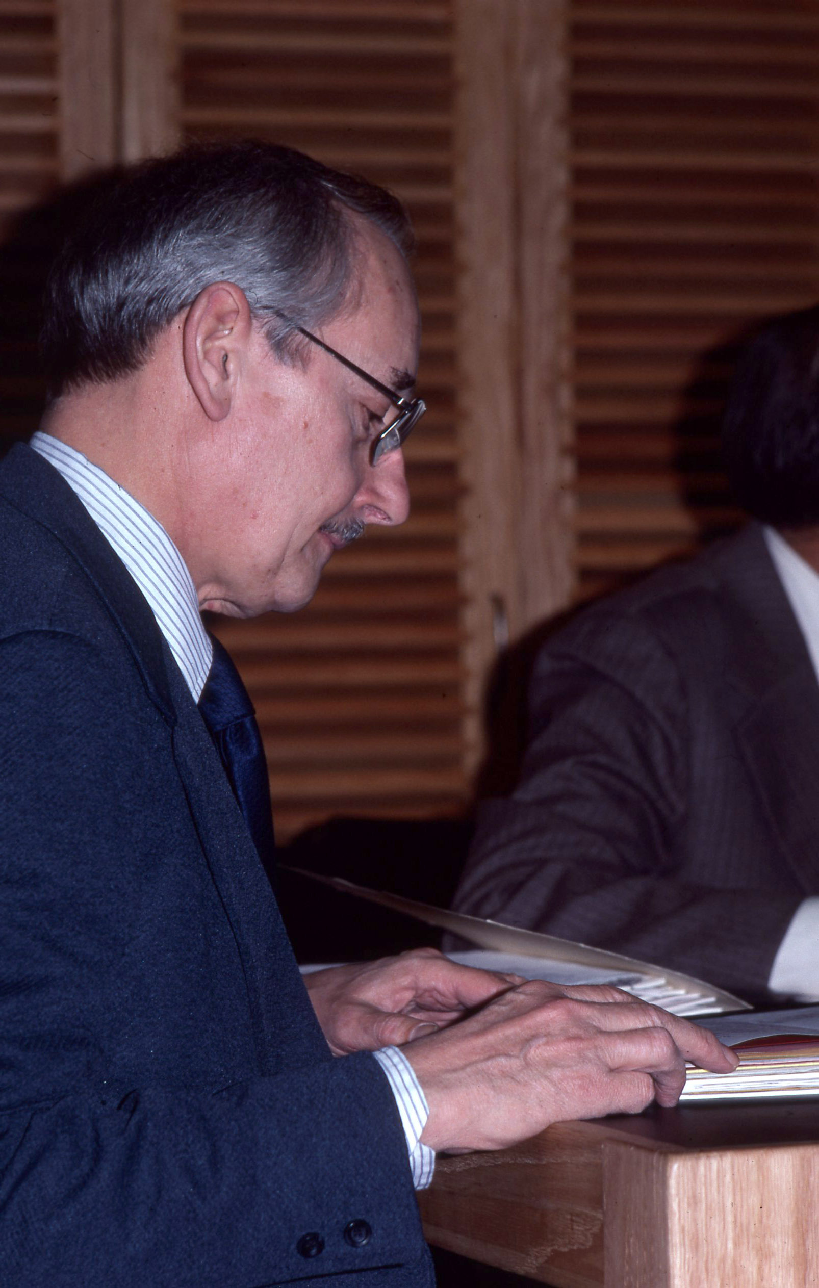 - Pacific University President James Miller examining papers while attending a Pacific University Board of Trustees meeting on the third floor of Marsh Hall. This is one of a set of photographs that were all taken during the same meeting. The original slide was printed in March, 1979.
